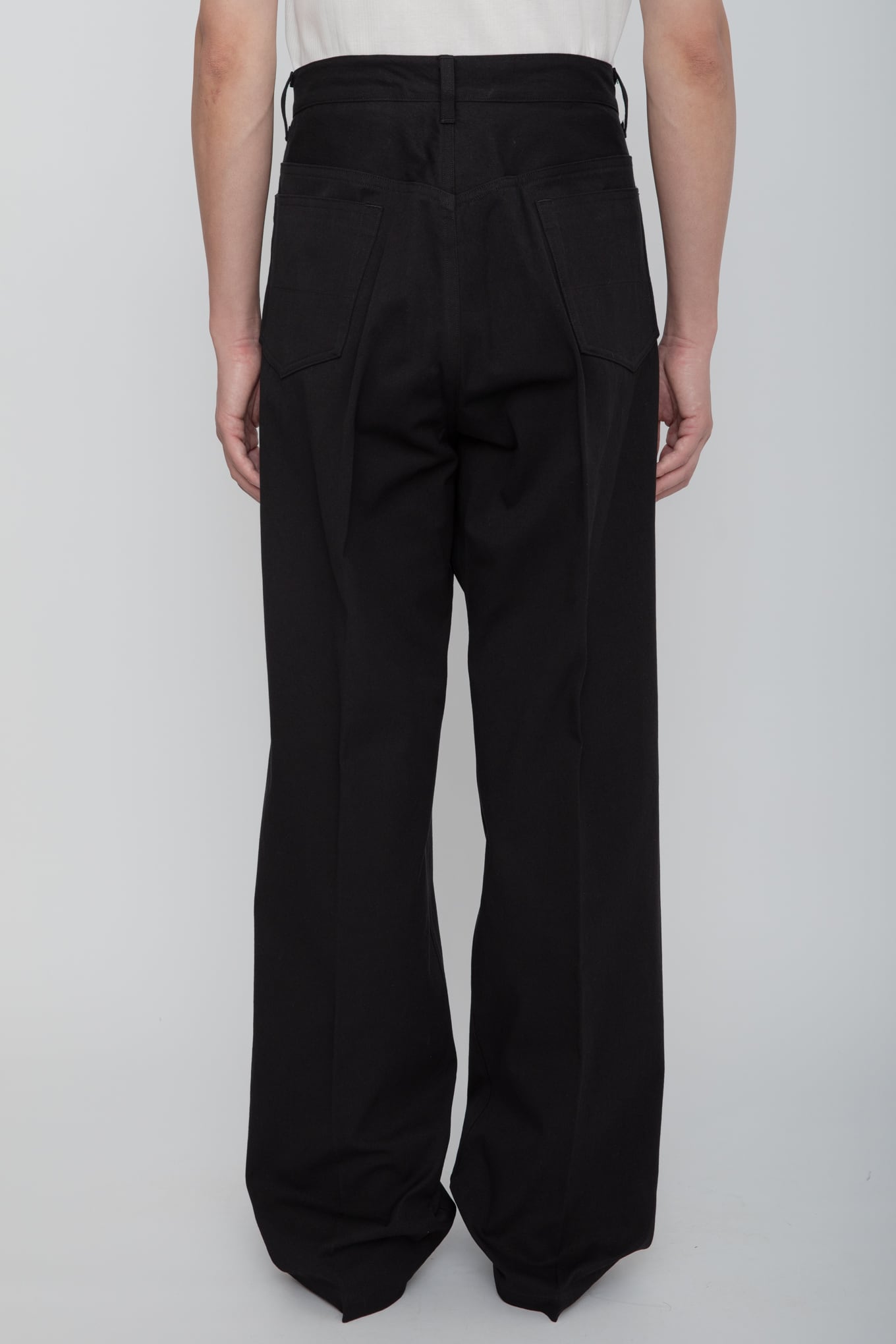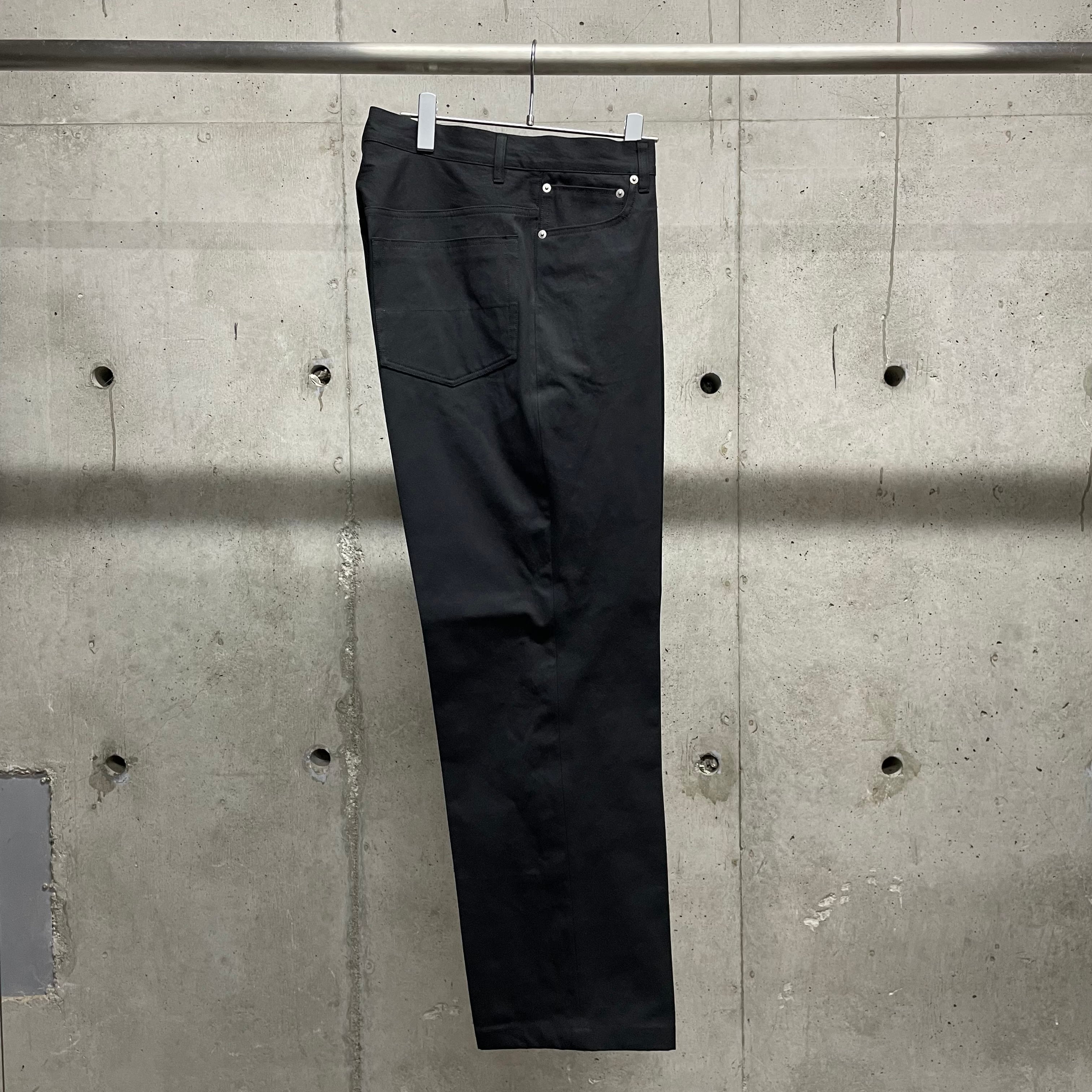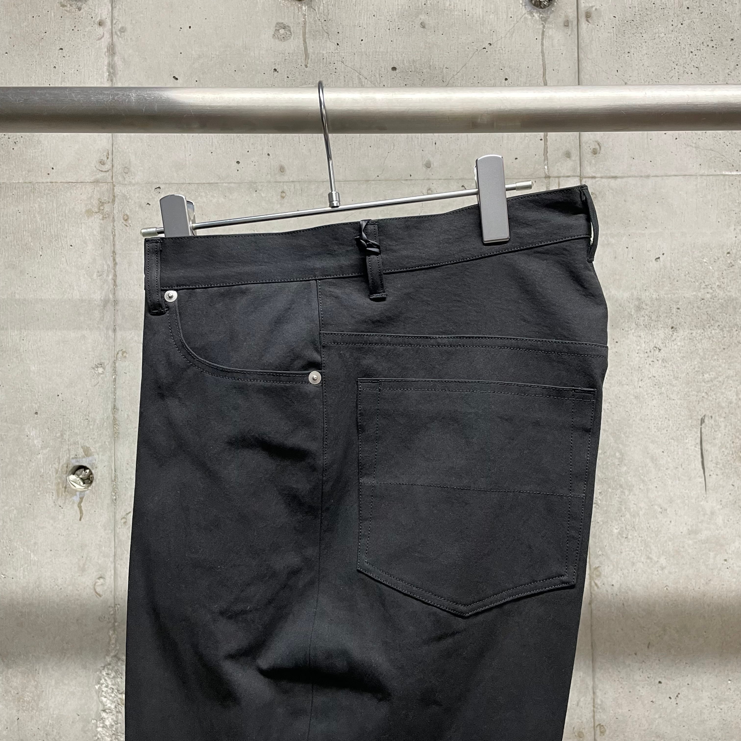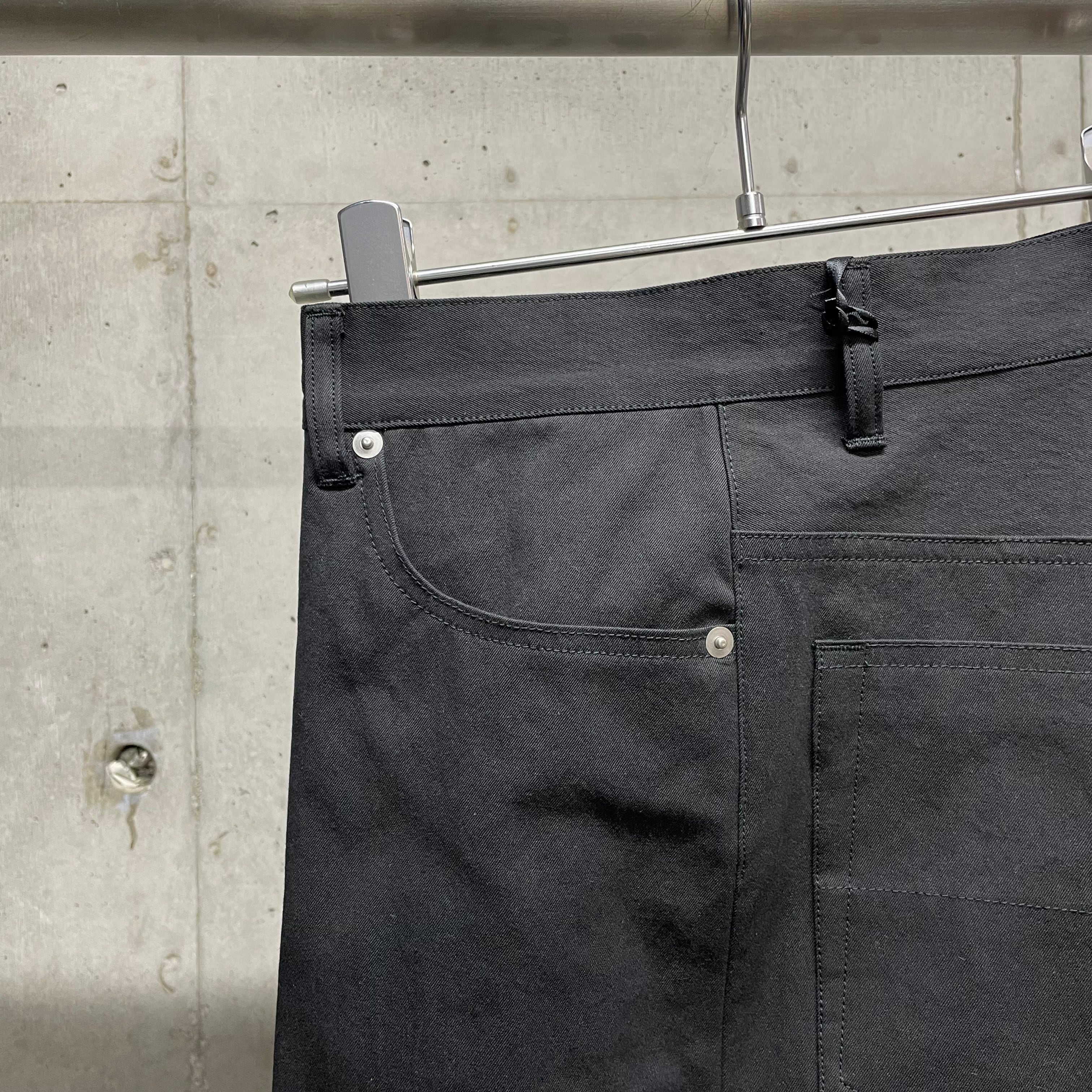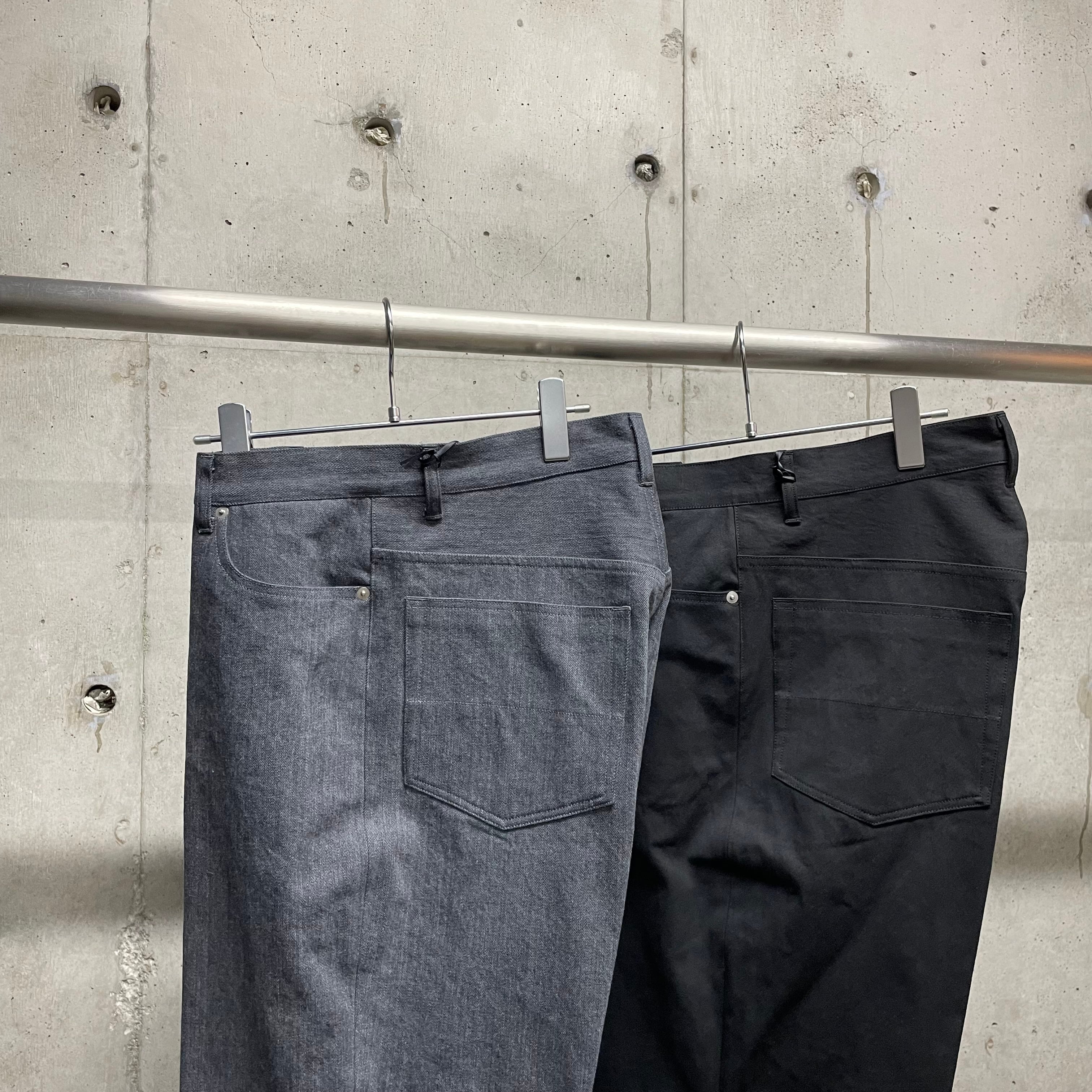 ゆったりとしたヒップ・ワタリから裾口に向けて真っ直ぐに落ちるワイドシルエットの5ポケットトラウザース。