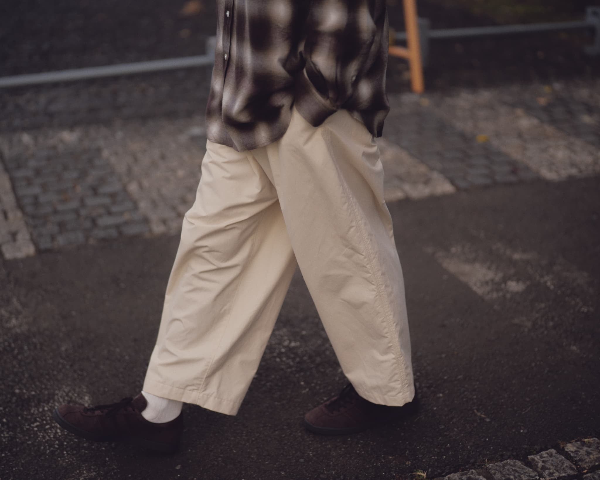 コットン52%、リヨセル48%の混紡生地を使用し、綿のドライな質感に、リヨセルのしなやかさと落ち感を掛け合わせました。製品洗いをかけることで、自然な表情とやわらかな風合いを引き出しています。